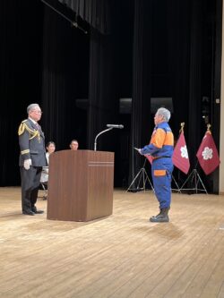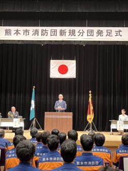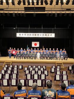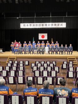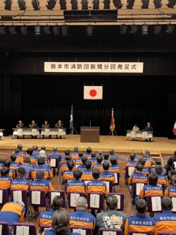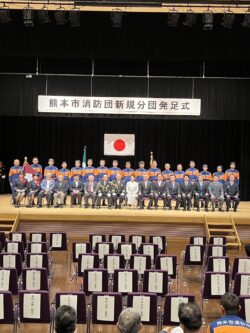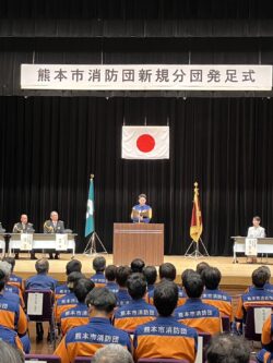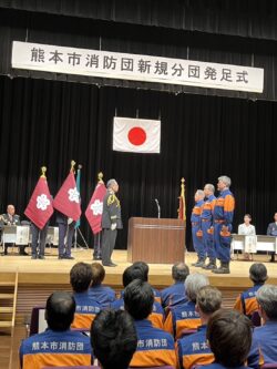 令和8年3月20日に、森都心プラザにて「新規分団発足式」を挙行しました。新規分団は39年ぶりであり、4月1日から第88分団(龍田西)、第89分団(長嶺)、そして第75分団を東西に分割する形で第90分団(富合)が誕生します。また、それぞれ第88・89分団には新たな機械倉庫や、車両・資機材の配備がありました。 今後ますます各小学校区において、地域に根差した活動を展開していただけたらと思います。